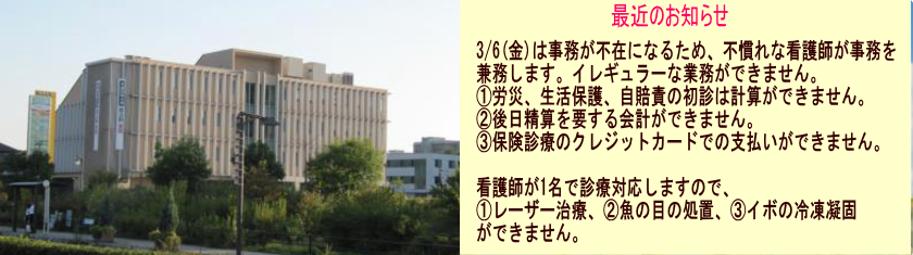 - 平成25年4月2日に開院した皮ふ科クリニックです。一般的な皮ふの病気はもちろんですが、皮ふ腫瘍の手術やレーザー治療など勤務医の時に行っていた治療もできるだけ続けたいと思います。